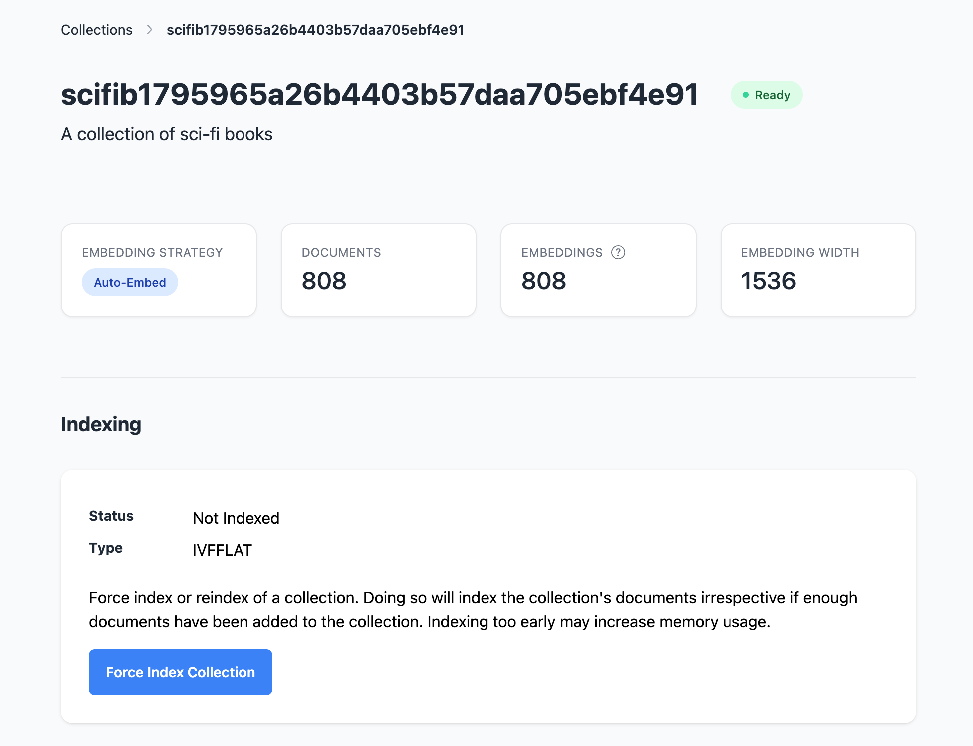 Manage document collections, indexes, and view embedding status: