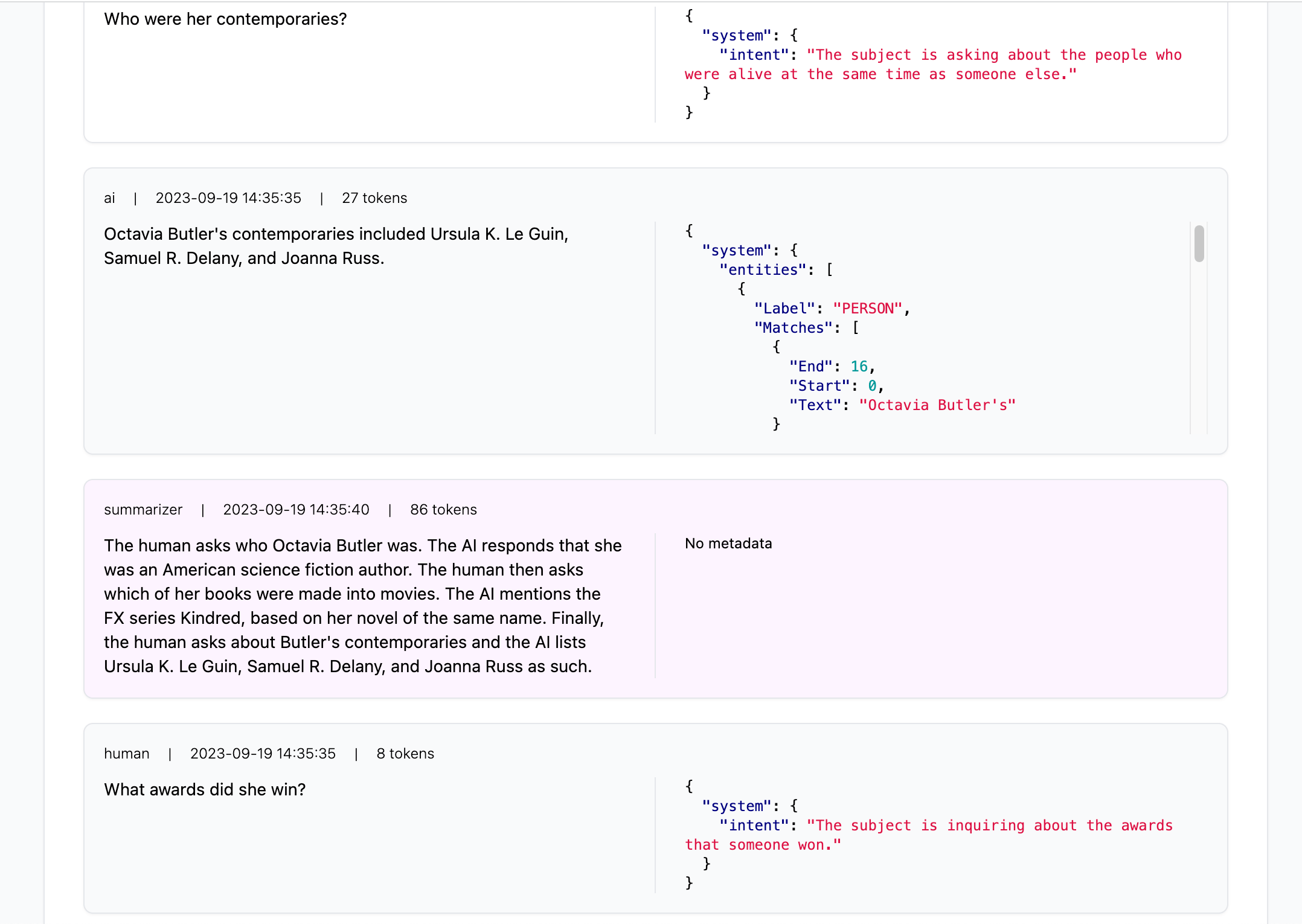 View complete Chat Histories and enrichment, such as summaries and named entities: