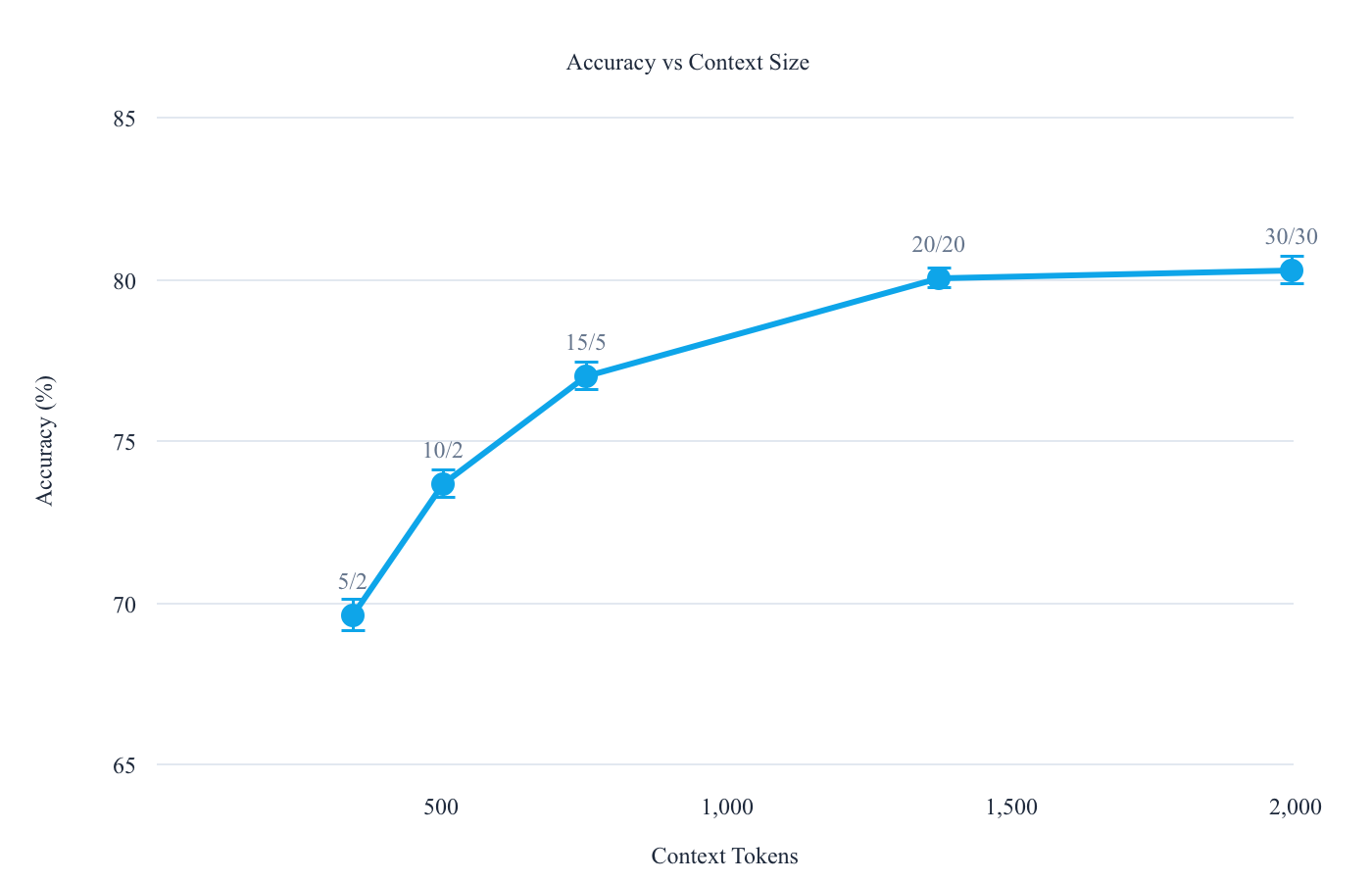 The diminishing returns curve is clear. Going from 5/2 to 20/20 buys you +10.4 percentage points of accuracy for roughly 4x the tokens. Going from 20/20 to 30/30 buys you +0.26 percentage points for 1.5x the tokens. The curve flattens, but it doesn't invert. More context doesn't hurt accuracy on this benchmark.