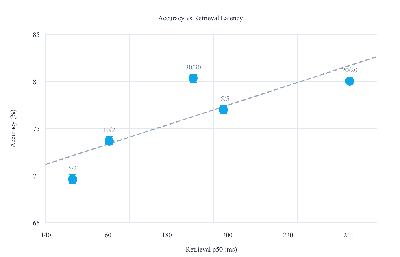 The gap between accuracy and completeness reveals robustness. At 5/2, we see 70% accuracy but only 57% completeness. The agent is succeeding on some questions despite inadequate context: lucky guesses, or questions simple enough to answer without full recall. At 30/30, accuracy (80%) and completeness (76%) track more closely. Tighter correlation means a more robust system.